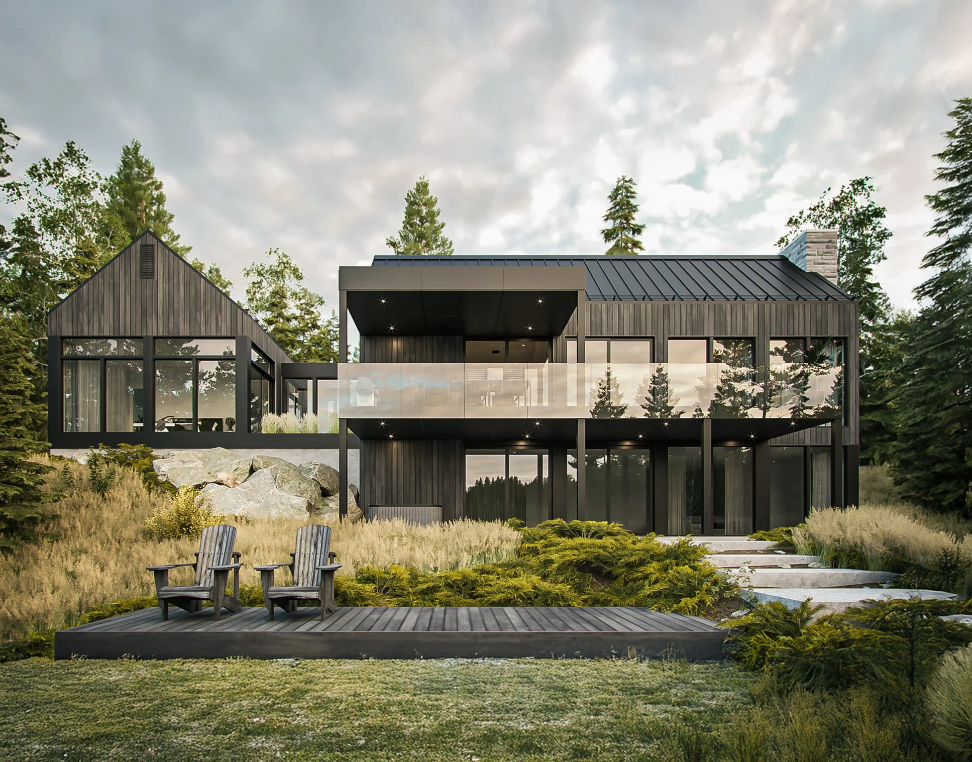 Toitures épurées, matériaux naturels et fenestration généreuse permettent de vivre en continuité avec la nature, dans un cadre calme, lumineux et inspirant.