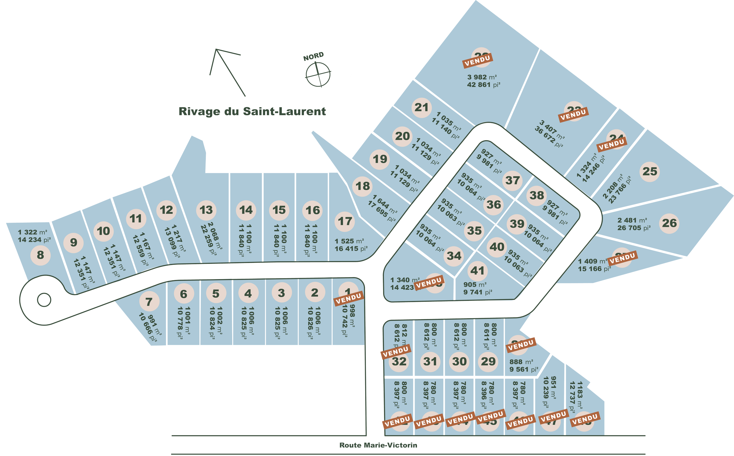 Découvrez notre sélection de terrains soigneusement aménagés et entièrement desservis, d’une superficie variant entre 10 000 et 20 000 pi².